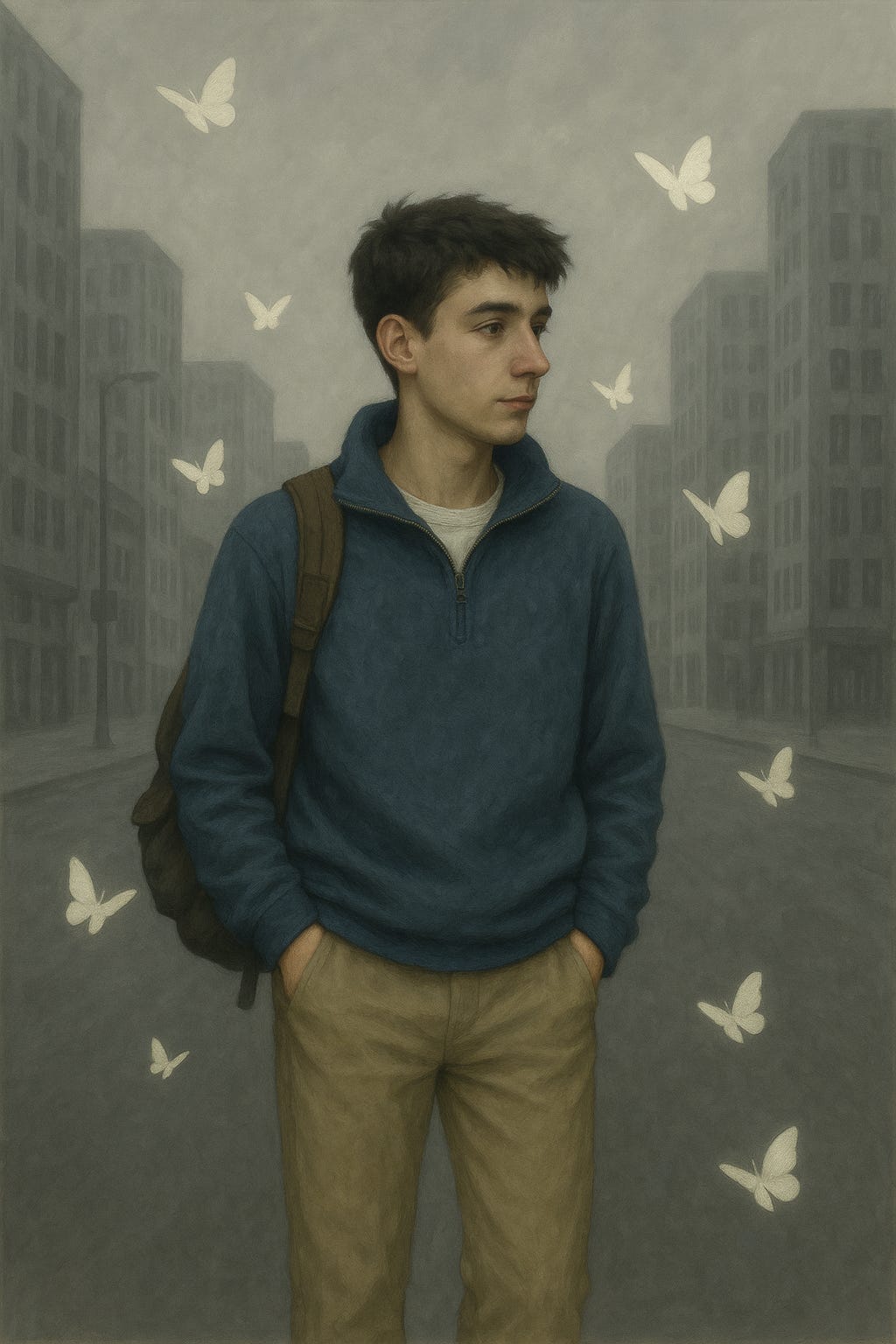 Pasaron las horas y terminaron las clases. Yo me iba sintiendo más y más cansado. Me despedí de mis amigos. El agotamiento me hacía reparar más en lo oscuro del cielo, en el agua que se posaba fría en las hojas de los arbustos a un lado de la acera que me llevaba de vuelta a casa. El color de los edificios cada vez tendía más al gris aburrido tan característico de esta ciudad y las mariposas blancas decidieron marcharse. Noté que se me secaba la boca y entonces volví a morir. El que saludaba a todos sus compañeros desapareció. Aquel día, como todos los días, pasé de oruga a mariposa y de mariposa a oruga. Me alcé un rato del suelo y volé, para volver a arrastrarme.